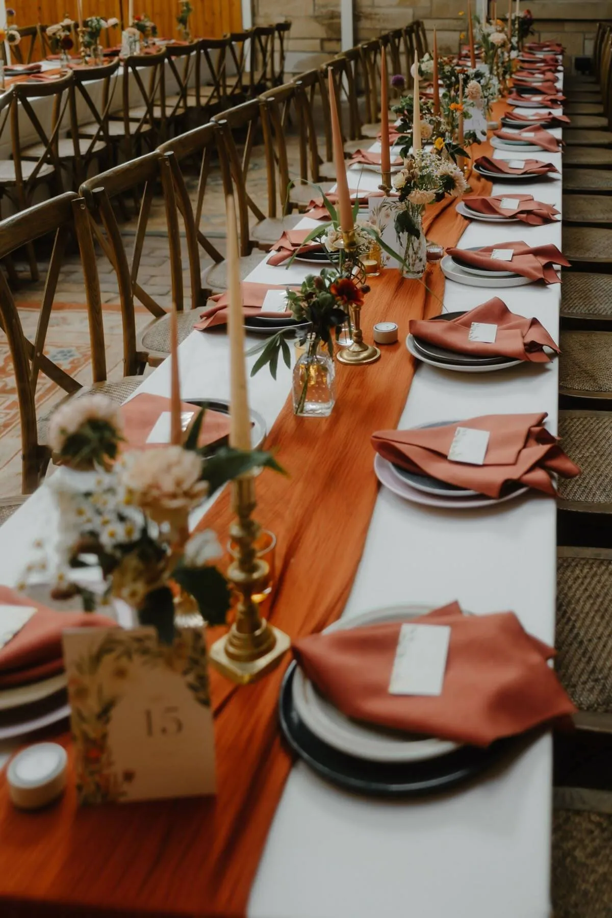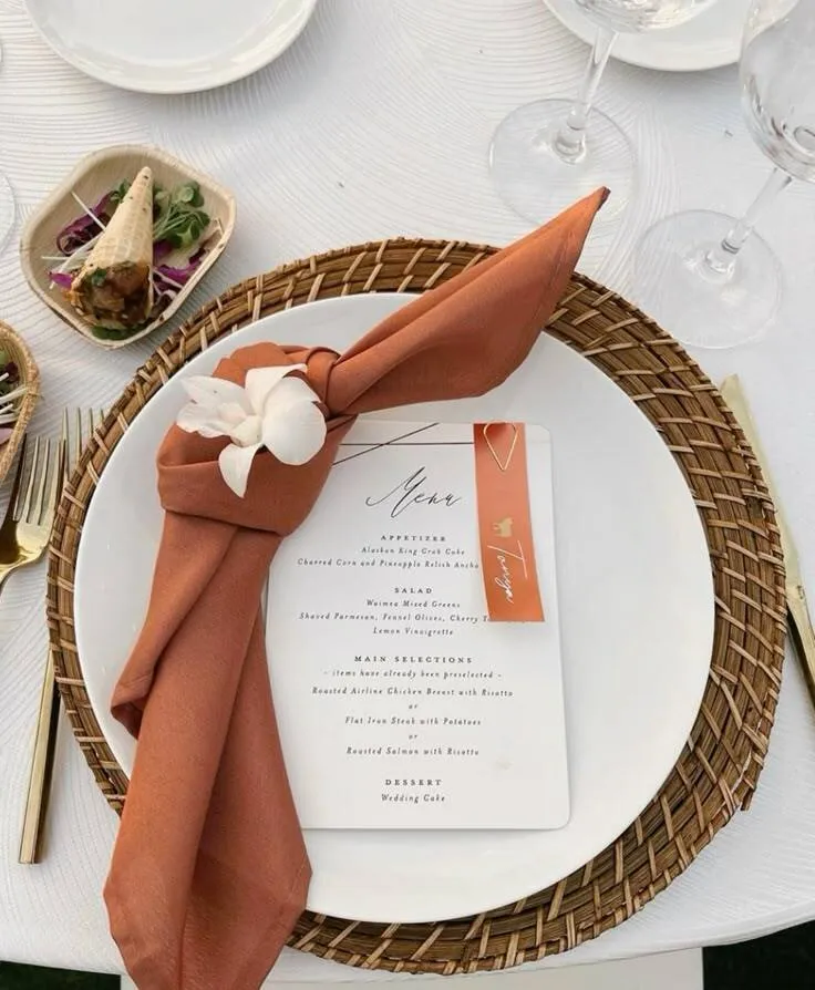 Bring warmth and sophistication to your event with our burnt orange/terra cotta cloth napkins. These 16" x 16" square napkins add a rich, earthy tone that complements rustic, boho, summer and autumn-inspired décor. Perfect for weddings, dinner parties, and special celebrations, they offer both style and functionality for your table settings.