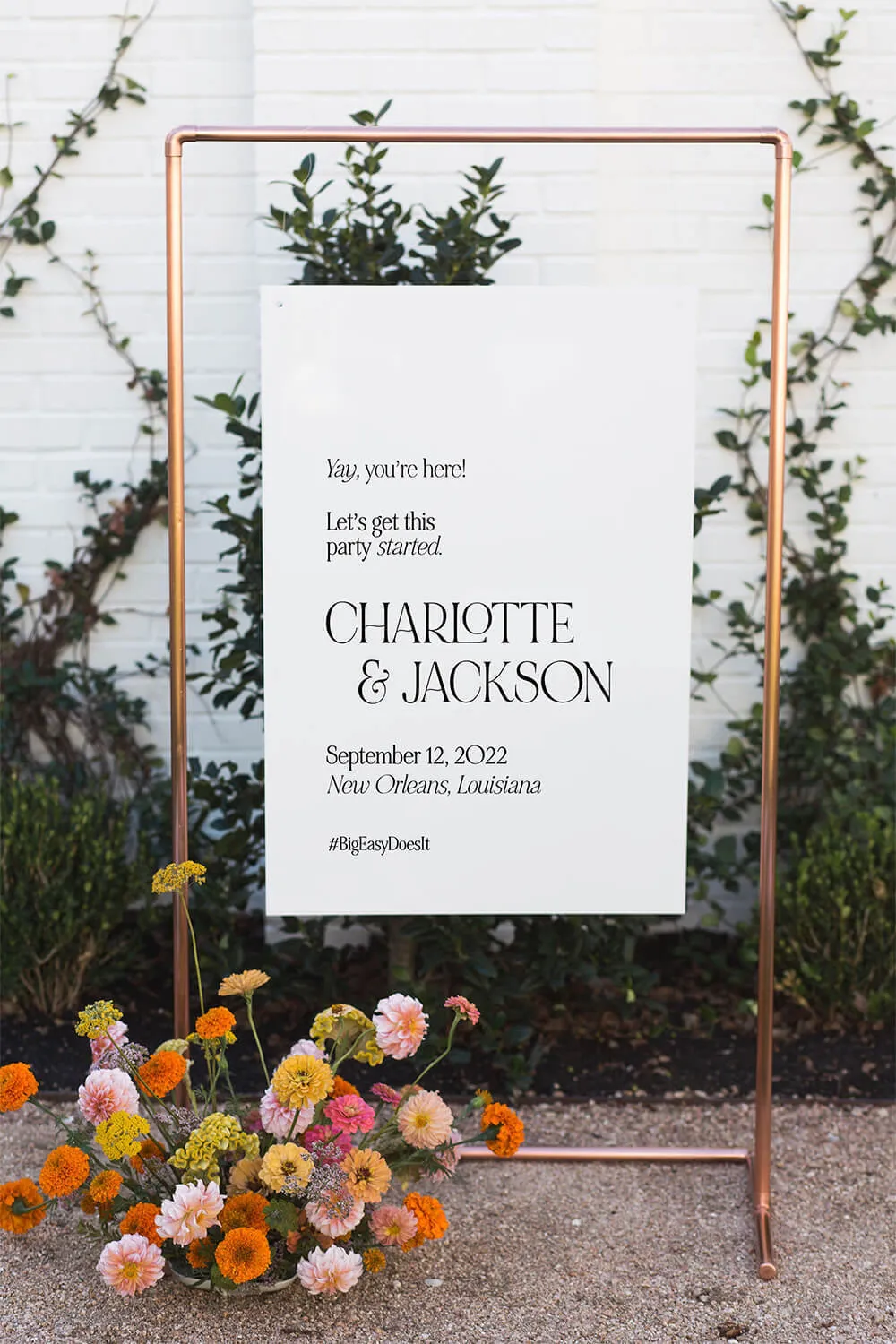 Add a touch of elegance to your event signage with our Copper Hanging Sign Stand! Measuring 31" wide by 63" tall, this versatile frame is perfect for showcasing fabric signs, acrylic signage, and more. Whether you're styling a wedding welcome sign, seating chart, or business display, this modern stand makes a stunning statement. 🌿🪧
