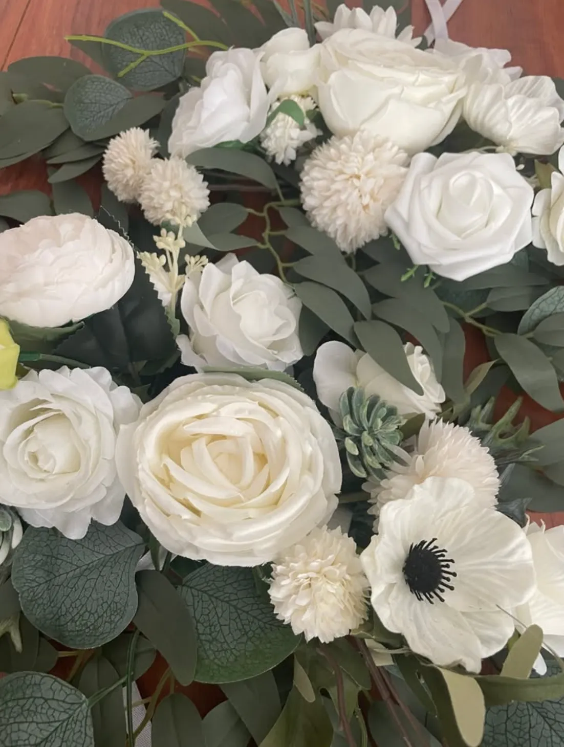 Elevate your event decor with our stunning floral swags, designed to complement wedding arbours, sweetheart tables, signage, or backdrop displays. These neutral-toned arrangements feature a timeless mix of white florals and lush greenery, making them perfect for any wedding or event theme.